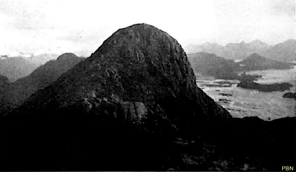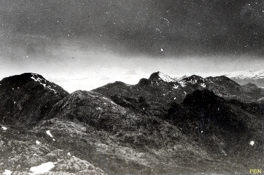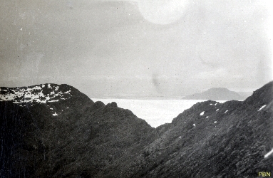 | Summit of the Knalhatten (Bowler Hat) taken from Stortoppen (Big Top - 760 m). Knalhatten was also known as Cerro Pan (0080) | Looking towards the Benito Glacier on left and Pyloros on right. The mud flats just evident on right. (0085) | Looking towards the Benito Glacier on left and Pyloros on right. The mud flats just evident on right. (0086) | Looking towards the South East and South (Benito) Glacier. The snow line on the range is about 500 m above sea level. (0081) | More of Kelly Glacier is revealed as well as Rabot Glacier flowing from the South Glacier (0087) |