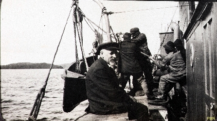 | Visit to Puerto Otway on the way (0267) | Sea view (0268) | On the way 'home'. Captain, the Professor, Allan and Sten (0269) | In the cabin at the stern of Yanez. Sten, Nils and the Professor (0270) | In the cabin at the stern of Yanez. Nils, Allan, the Professor and Sten (0271) |