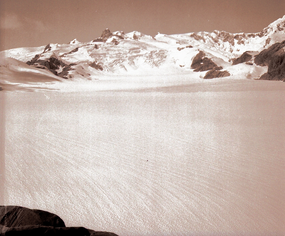 | View of the Accumulation Zone of Glacier Benito from 'Level 1' Upper Cairn on Co Caldenius in February 1973 | Same view in April 2017. |