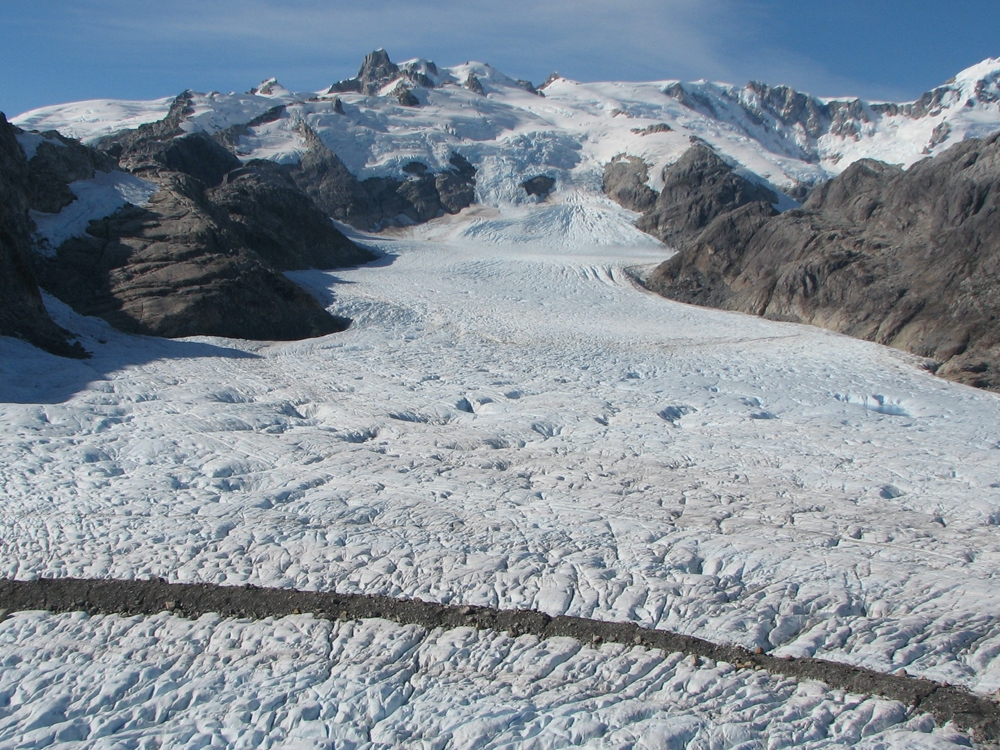 | Another view of the majestic peaks in the accumulation zone of Glacier Benito from 'Stake 10'. | Same view in April 2017 taken by our drone at a similar altitude to Stake 10 in 1973. |