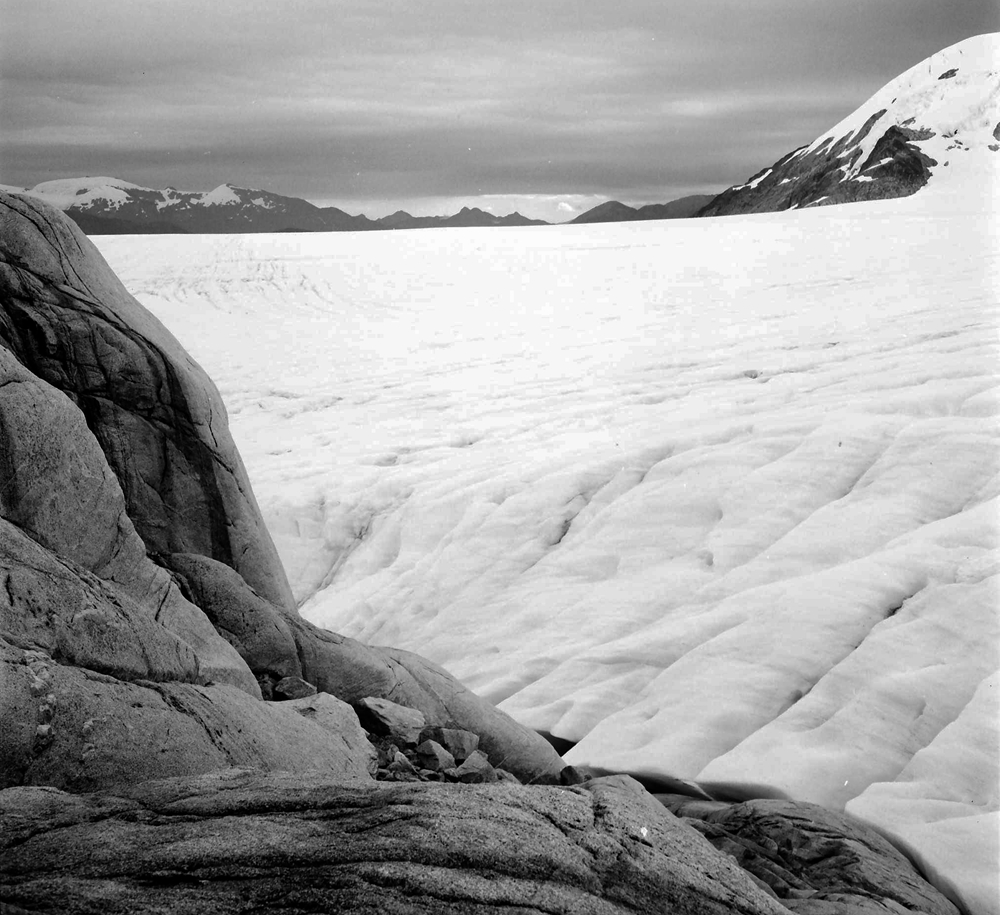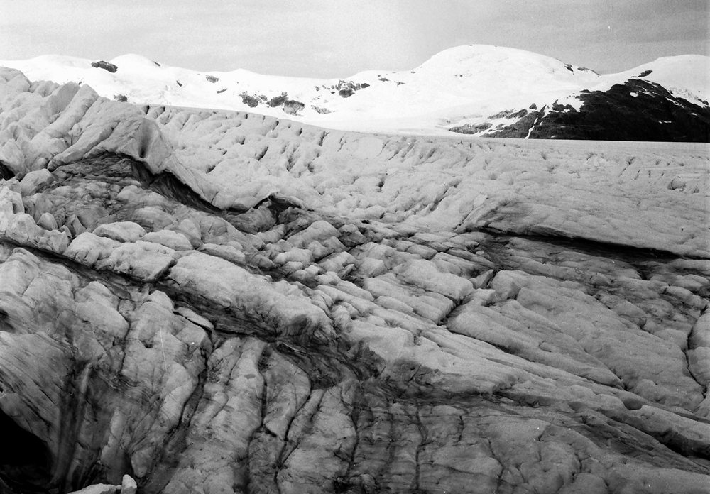 | View from 'Level 2' Lower Cairn at the Finger looking at 'Dump Ridge' in February 1973 | Same view in April 2017. The surface of the glacier is now over 135 meters lower. |