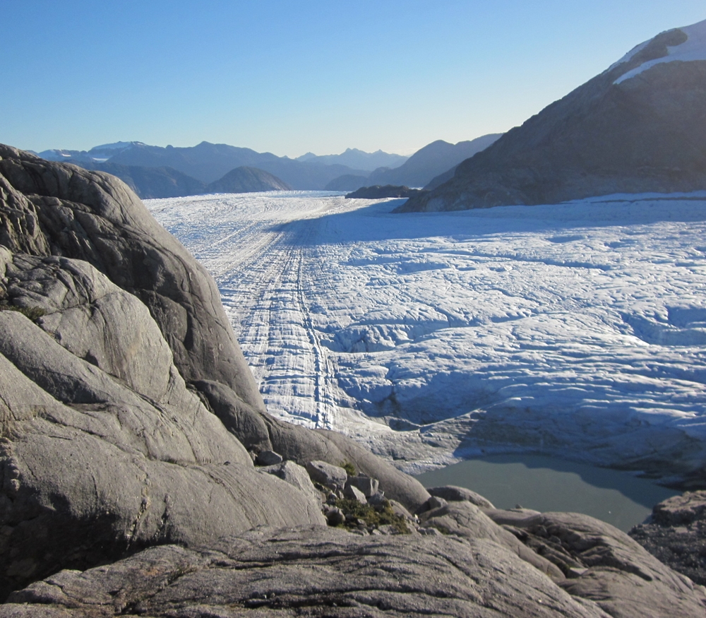 | View from 'Level 1' Upper Cairn at the Finger looking down glacier in February 1973 | Same view in April 2017. |