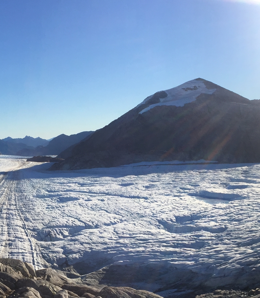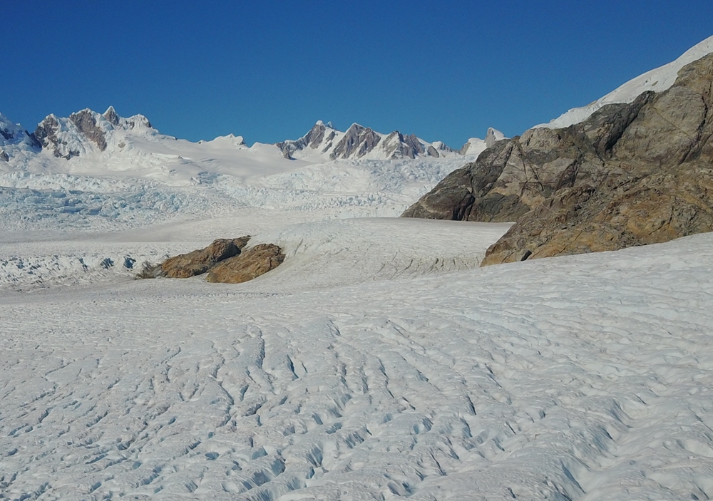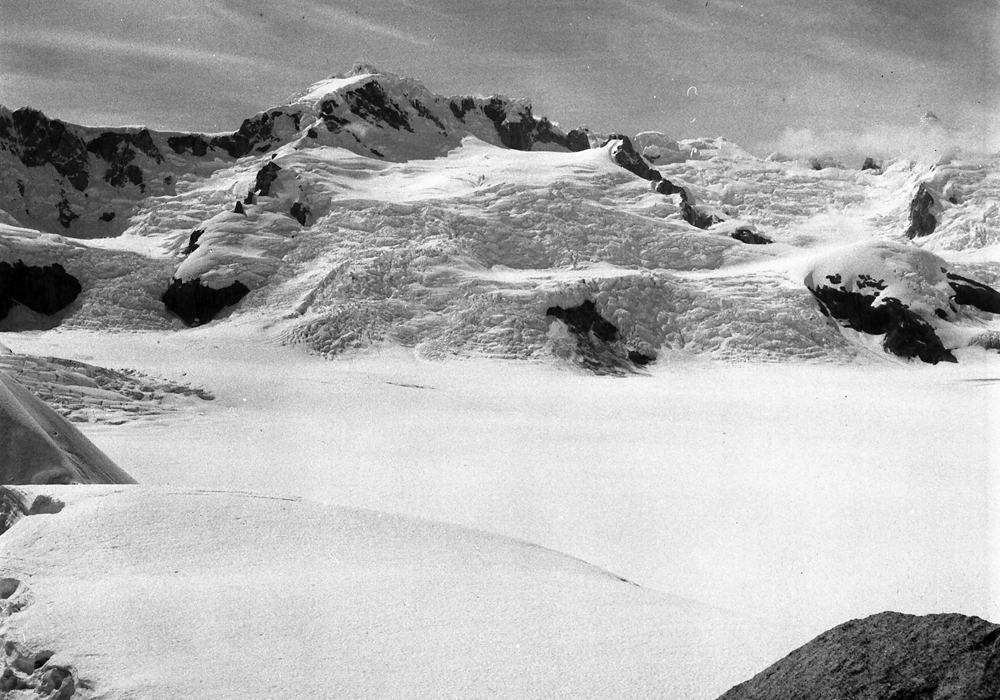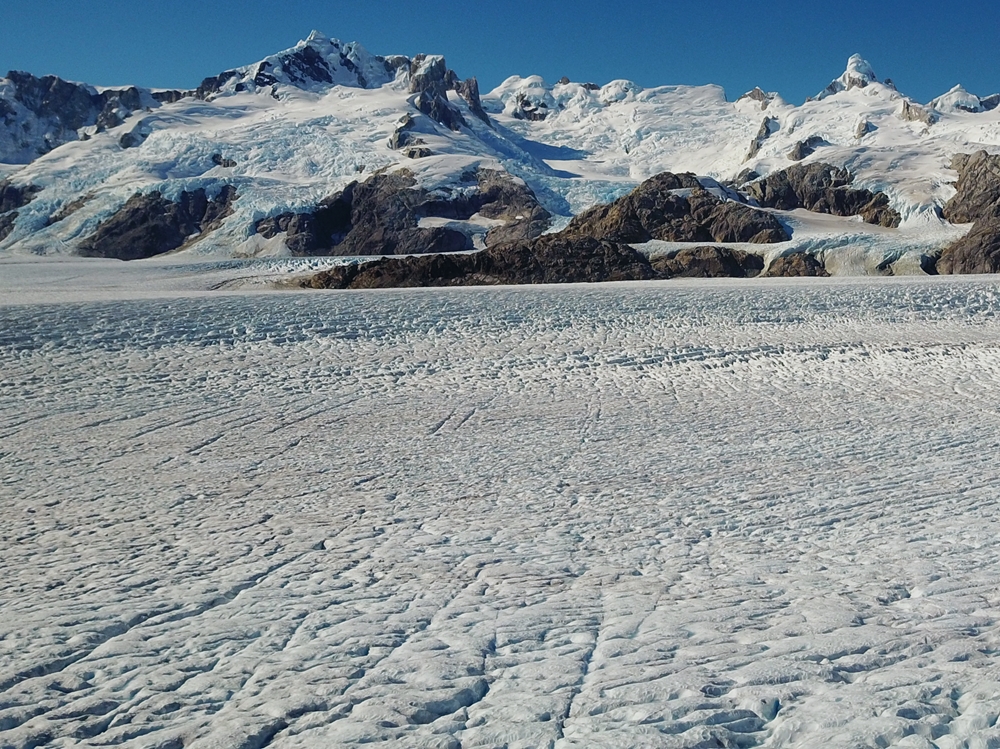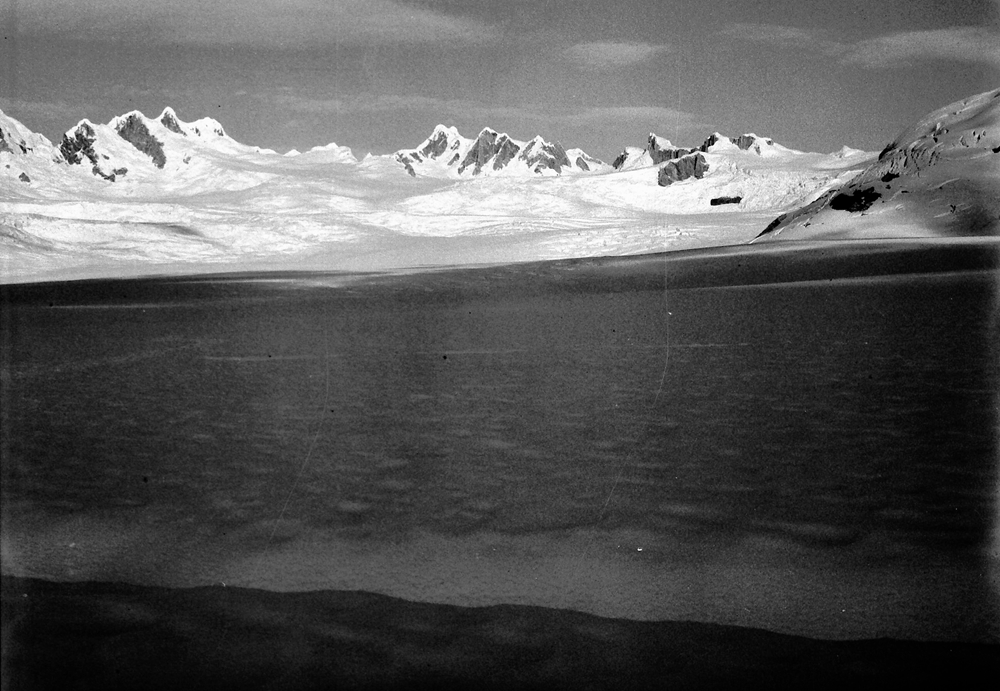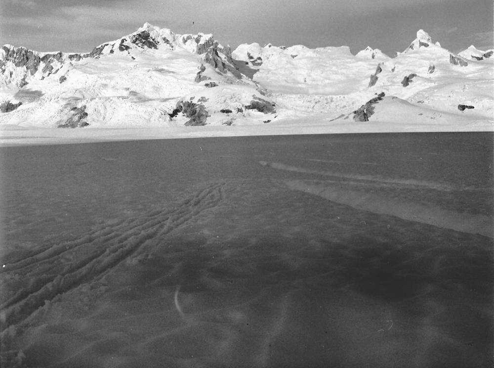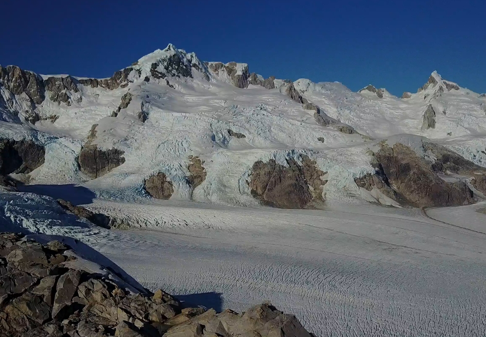 | This photo was taken in mid March 1973 at 'Stake 10' looking at the majestic peaks in the accumulation zone of Glacier Benito. | Same view in April 2017 taken by our drone at a similar altitude to Stake 10 in 1973. |