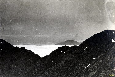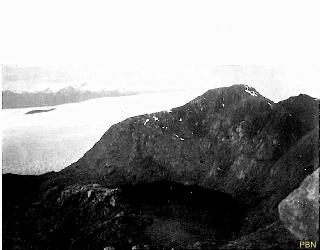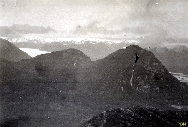 | Summit of the Knalhatten (Bowler Hat) taken from Stortoppen (Big Top - 760 m). Knalhatten was also known as Cerro Pan (0080) | Looking towards the Benito Glacier on left and Pyloros on right. The mud flats just evident on right. (0085) | Looking towards the Benito Glacier on left and Pyloros on right. The mud flats just evident on right. (0086) | Looking towards the South East and South (Benito) Glacier. The snow line on the range is about 500 m above sea level. (0081) | More of Kelly Glacier is revealed as well as Rabot Glacier flowing from the South Glacier (0087) |