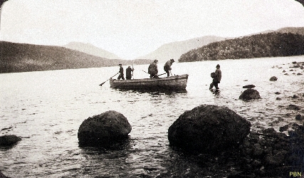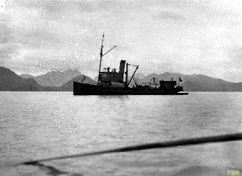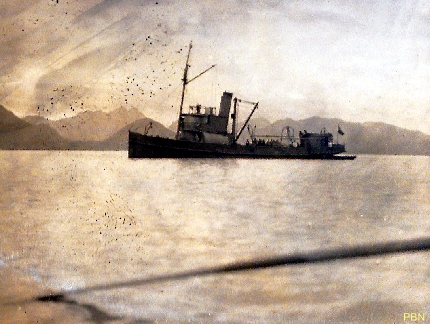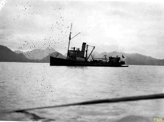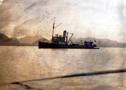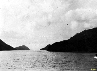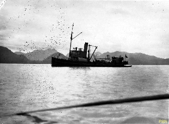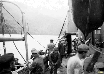 | The Yanez returns to pick up the Expedition (0254) | Embarking on board the Yanez (0258) | Setting 'sail' for Puerto Montt (0259) | One of the last view of Kelly Inlet (0260) | Photograph shows Glacier San Tadeo on the left and Kelly Inlet on the right of the Ridge which they climbed over (0262) |
